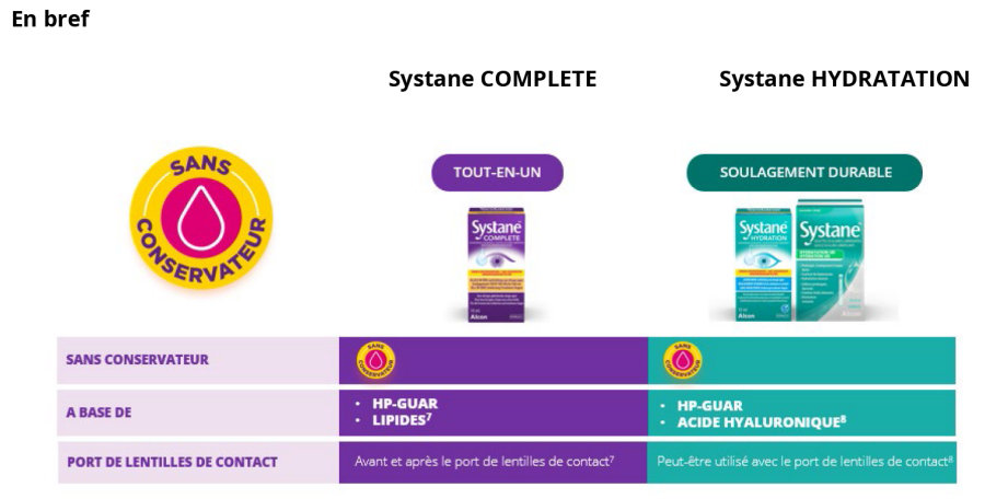 - Une gamme de deux produits Systane® COMPLETE, une solution tout-en-un1 et Systane® HYDRATATION pour les sécheresses oculaires chroniques2