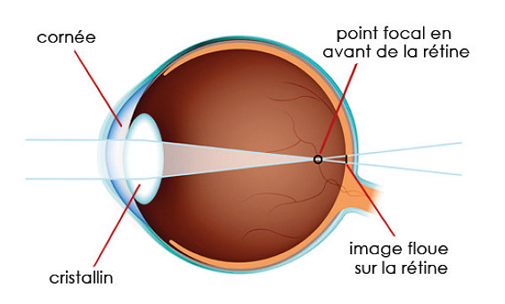 La myopie est liée à une croissance trop importante de la longueur axiale du globe oculaire (œil trop long). De fait, la focalisation de l’image d’un objet éloigne se forme en avant de la rétine, et non sur la rétine. Conséquence : le myope a une vision nette de près et floue de loin.
