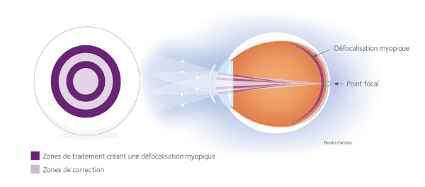 Les deux zones de traitements permettent une correction complète de la myopie dans toutes les directions du regard. Les zones de traitement sont, quant à elles, conçues pour assurer une défocalisation myopique adaptée a toutes les prescriptions, aux changements de diamètre pupillaire et aux variations de centrage des lentilles. L’image est ainsi focalisée en avant de la rétine plutôt qu’en arrière, ce qui ralentit l’élongation axiale..