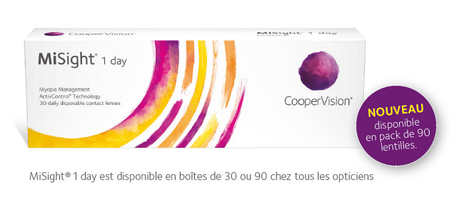 * Indications d’utilisation : les lentilles souples MiSight® 1 day (omafilcon A) à usage unique et à port journalier sont indiquées pour la correction de la myopie et pour ralentir la progression de la myopie chez les enfants sans contre-indication médicale et qui, au début du traitement, sont âgés de 8 à 12 ans et ont une réfraction de -0,75 à -4,00 dioptries (équivalent sphérique) avec ≤ 0,75 dioptrie d’astigmatisme. La lentille doit être jetée après chaque retrait.
