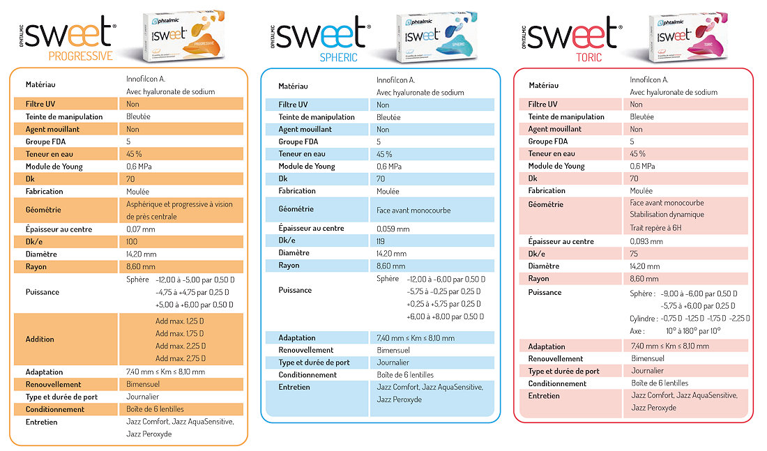 Après le succès de la lentille bimensuelle Ophtalmic Sweet Progressive auprès des presbytes, l’adaptation devient aussi possible avec le même matériau et la même technologie pour les myopes, hypermétropes ou astigmates avec Ophtalmic Sweet Spheric et Ophtalmic Sweet Toric ! Avec l’avènement de ces deux nouvelles lentilles Ophtalmic nous offre une gamme complète de lentilles bimensuelles en silicone-hydrogel permettant un confort optimisé grâce à la présence de hyaluronate de sodium.
