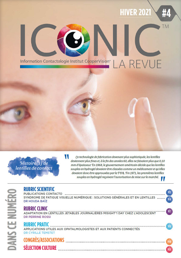 Lancée au printemps 2021 par CooperVision, ICONIC™ est une Revue trimestrielle avec un contenu 100% contactologie, des thématiques 100% sélectionnées par un Comité Scientifique constitué à 100% d’Ophtalmologistes Contactologues et rédigé à 100% par des Experts, icônes dans leur spécialité. A chaque numéro de la REVUE ICONICTM (Information Contactologie Institut CooperVision®), trois RUBRICS : une RUBRIC SCIENTIFIC pour être au fait des dernières publications et élargir son champ de vision en (re)découvrant des domaines connexes aux lentilles ; une RUBRIC CLINIC qui a à cœur de mettre en lumière ce que représente la contactologie pour les patients et enfin une RUBRIC PRATIC source de bons conseils pour optimiser l’exercice de la contactologie au sein des cabinets.