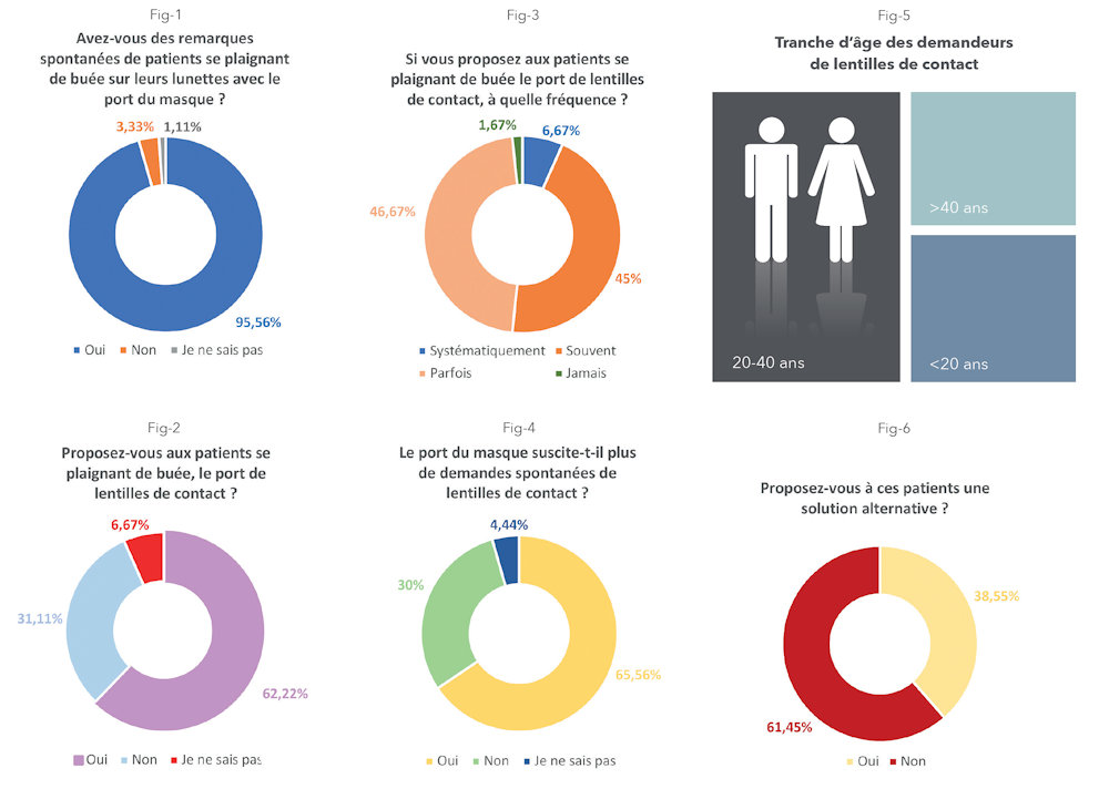 Par ailleurs, certains ophtalmologistes (39%) proposent aussi des solutions alternatives autres que les lentilles de contact face au problème de buée sur les lunettes (fig-6). Il s’agit notamment de traitement antibuée pour les lunettes, de rappeler aux patients de bien porter et/ou fixer leurs masques,et enfin de corriger leur défaut visuel par le biais de la chirurgie réfractive ou de l’orthokératologie.